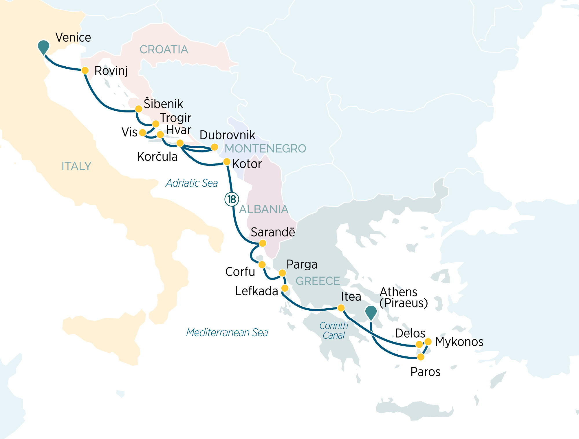 From the Adriatic’s stunning Dalmatian coastline, studded with authentic Croatian port towns drenched in medieval history, to the dazzling Greek islands peppered across the azure Aegean Sea and a memorable passage through the man-made Corinth Canal, experience a grand Mediterranean adventure like no other.