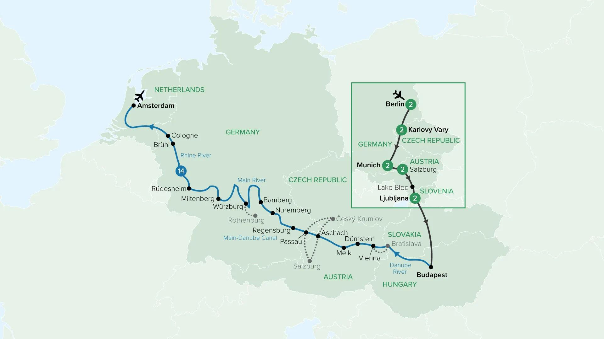 Celebrate the festive spirit of Europe from Berlin to Amsterdam on a journey rich in culture, history and seasonal charm. Explore grand capitals, alpine towns and storybook villages adorned with Christmas lights and traditional markets before boarding your river ship. Cruise the Danube, Main and Rhine through elegant cities and medieval landscapes, ending among Amsterdam’s iconic canals.