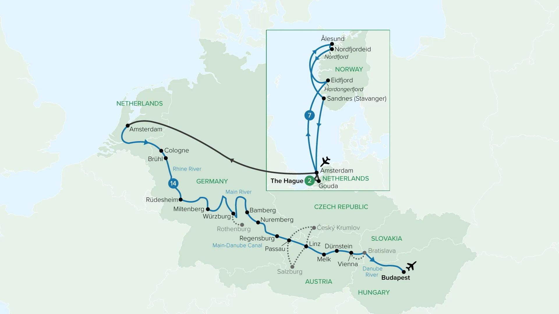 Set out from Amsterdam with Holland America Line cruise to Norway’s spectacular fjords, where sheer cliffs, waterfalls and colourful coastal towns frame each day at sea. After returning to the Netherlands, continue by river aboard your Travelmarvel ship, tracing the Rhine, Main and Danube through storybook villages and grand capitals. From the Wachau Valley and Vienna to the historic streets of Budapest, this journey pairs ocean and river cruising for a varied exploration of Europe.