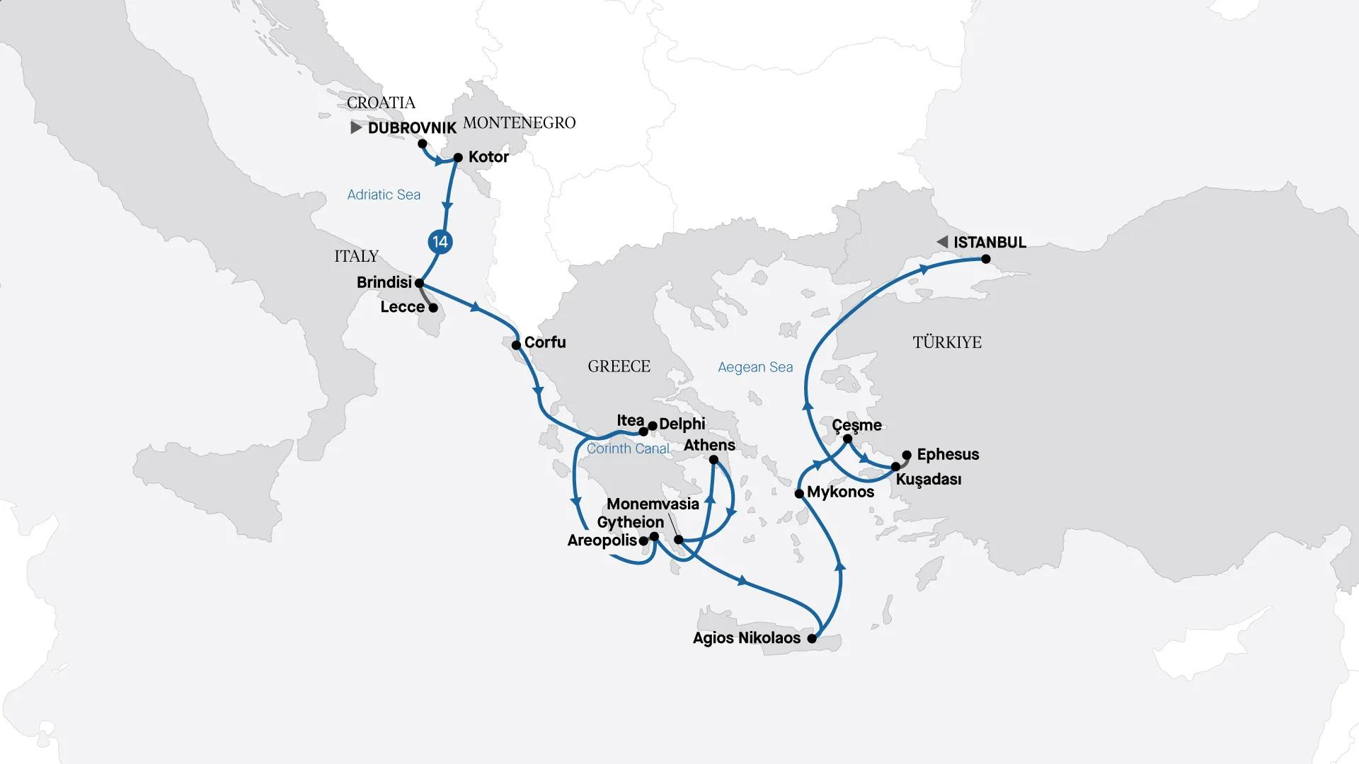 Cruise from Dubrovnik to Istanbul, uncovering the coastal jewels of the Adriatic, Ionian and Aegean seas. Stroll along charming cobbled streets in medieval towns and cities, and admire superbly preserved archaeological sites that reveal the legacy of ancient civilisations. Follow the enticing aroma of freshly baked local delicacies before enjoying a tasting, then conclude your epic voyage in magnificent Istanbul, renowned for its architectural splendour and celebrated cuisine.