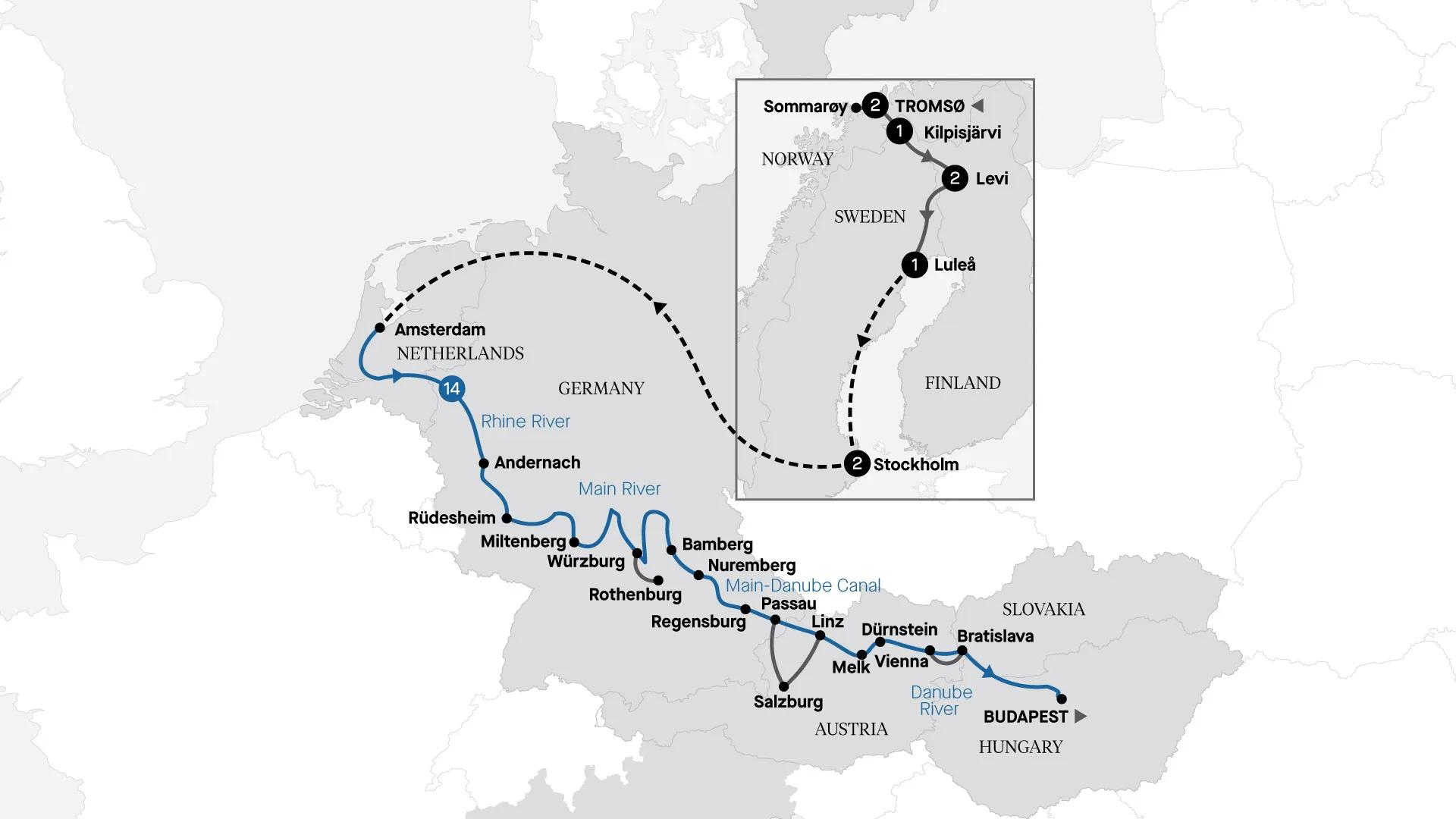 Your Small Group Tour of a maximum of 24 guests begins above the Arctic Circle in Tromsø, a picturesque town framed by soaring mountains and fjords. Visit a husky farm and enjoy an exhilarating sled ride through snow-blanketed mountains. Delight in an unforgettable stay in a glass-domed igloo, offering a rare opportunity to perhaps witness the northern lights from the comfort of your bed. Then, continue your journey to Amsterdam, where you'll board APT's new-generation luxury river vessel for an unforgettable 14-night cruise to Budapest.