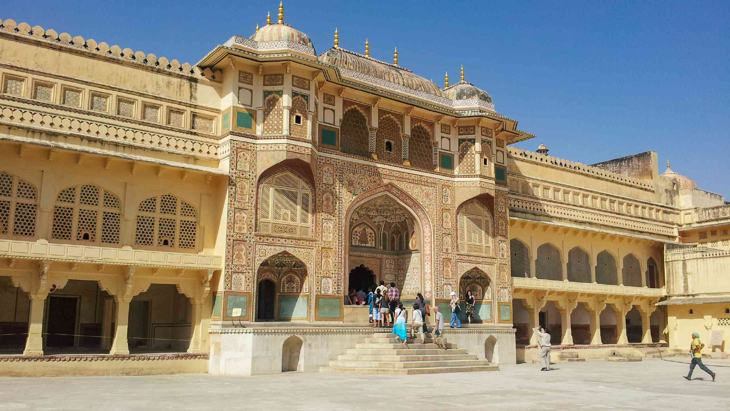 Today, enjoy a photo stop at one of the most iconic landmarks to grace Jaipur’s skyline — the Hawa Mahal. This peachy-red monument towers in brilliant contrast to the blue skies surrounding it, stretching five stories high and featuring 953 intricately carved windows (jharokhas), designed for royal women to observe street life while remaining unseen.