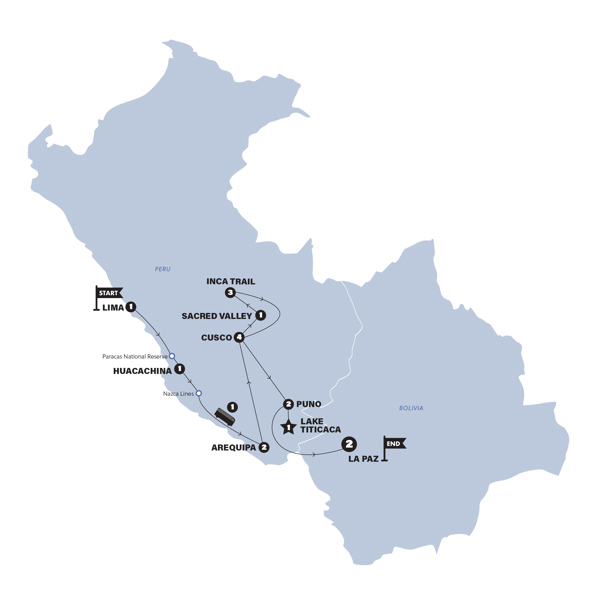 Nineteen days. Peru to Bolivia. Big views, homestays, local transport and backpacking stories you’ll keep forever. Kicking off with top-tier eats in Lima, you’ll roll down the coast to Paracas, Huacachina’s dunes and the Nazca Lines, all the way to Arequipa’s white-stone streets. Next up: Cusco, then trekking the Inca Trail to Machu Picchu. Finish strong on the Route of the Sun to Puno, a Lake Titicaca homestay, then cross into Bolivia to roll into La Paz.