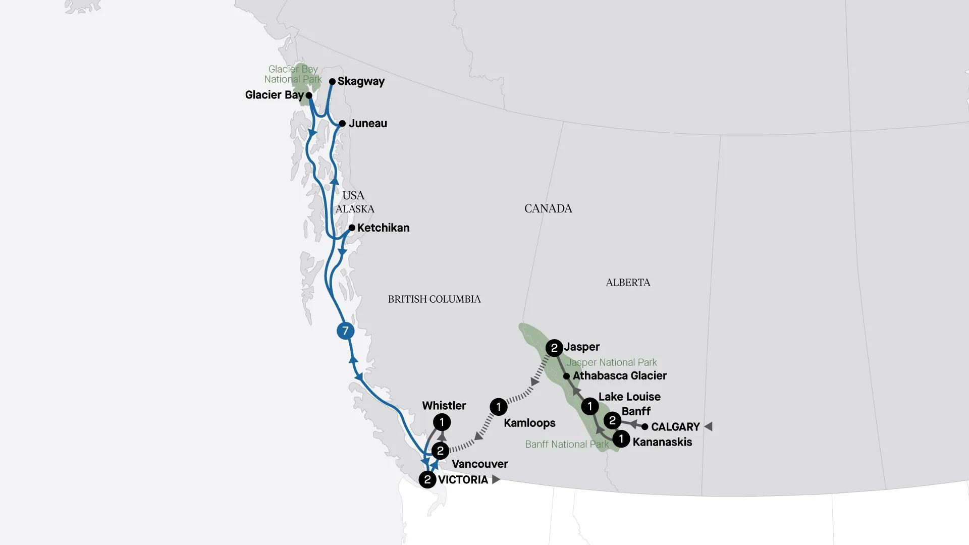 Embark on a spectacular Small Group Tour spanning the soaring, snowcapped Rocky Mountains of Calgary to the Strait of Georgia near Victoria in British Columbia. Witness the immense natural beauty of Canada and gain a deeper insight into the people, culture, cuisine, history and wildlife of this captivating nation. Experience what it takes to be an ice hockey player, travel aboard the luxurious Rocky Mountaineer, and sample local cider at a distillery enjoyed with shared charcuteries boards. After your land journey, step aboard Holland America Line's Koningsdam ship and explore Alaska's legendary Inside Passage on a seven-night ocean cruise, visiting iconic destinations such as Glacier Bay, while keeping a close watch for the region's famous wildlife.