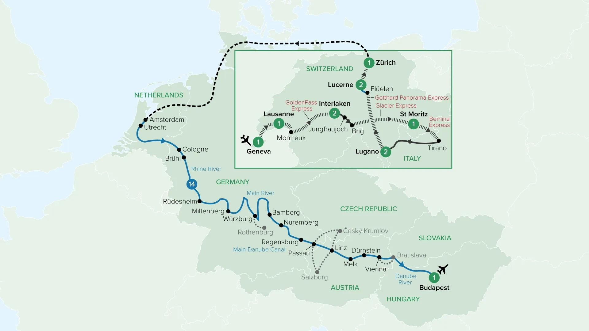 From the lakeside elegance of Geneva to the grand boulevards of Budapest, this remarkable journey showcases Europe at its most captivating. Travel through Switzerland on panoramic railways, including the GoldenPass, Glacier Express and Bernina Express, before cruising the Rhine, Main and Danube rivers past medieval towns and imperial capitals, where cobbled streets, baroque architecture and centuries of history unfold at every turn.