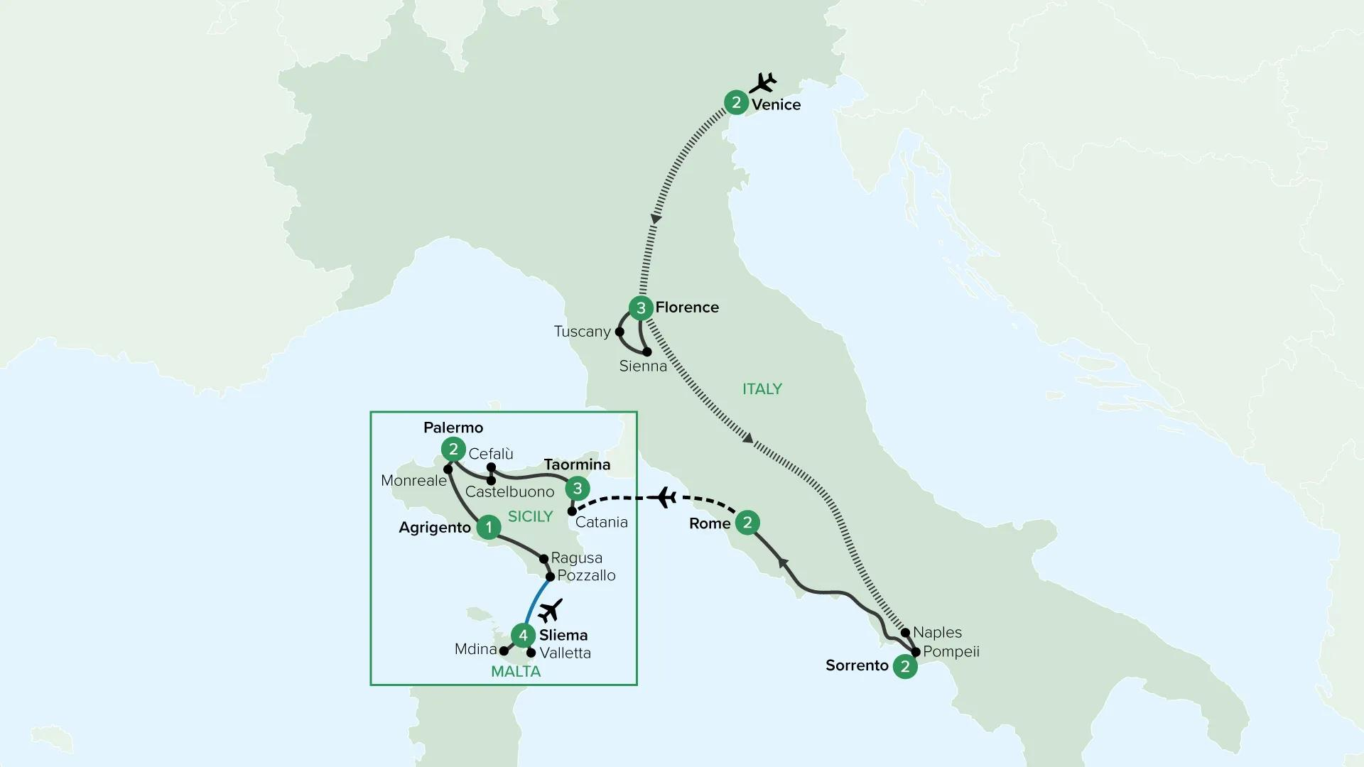 Experience Italy in all its splendour on a small group tour from Venice to Malta. Travelling with no more than 24 guests, begin among Venice’s canals before travelling to Florence and the Tuscan countryside, then continue south to the coastal beauty of Sorrento, the ruins of Pompeii and the eternal city of Rome. Cross to Sicily to discover Mount Etna, Taormina and Palermo, where vibrant street life reveals the island’s layered past. Your adventure concludes in Malta, exploring elegant Valletta and the honey-coloured streets of Mdina.