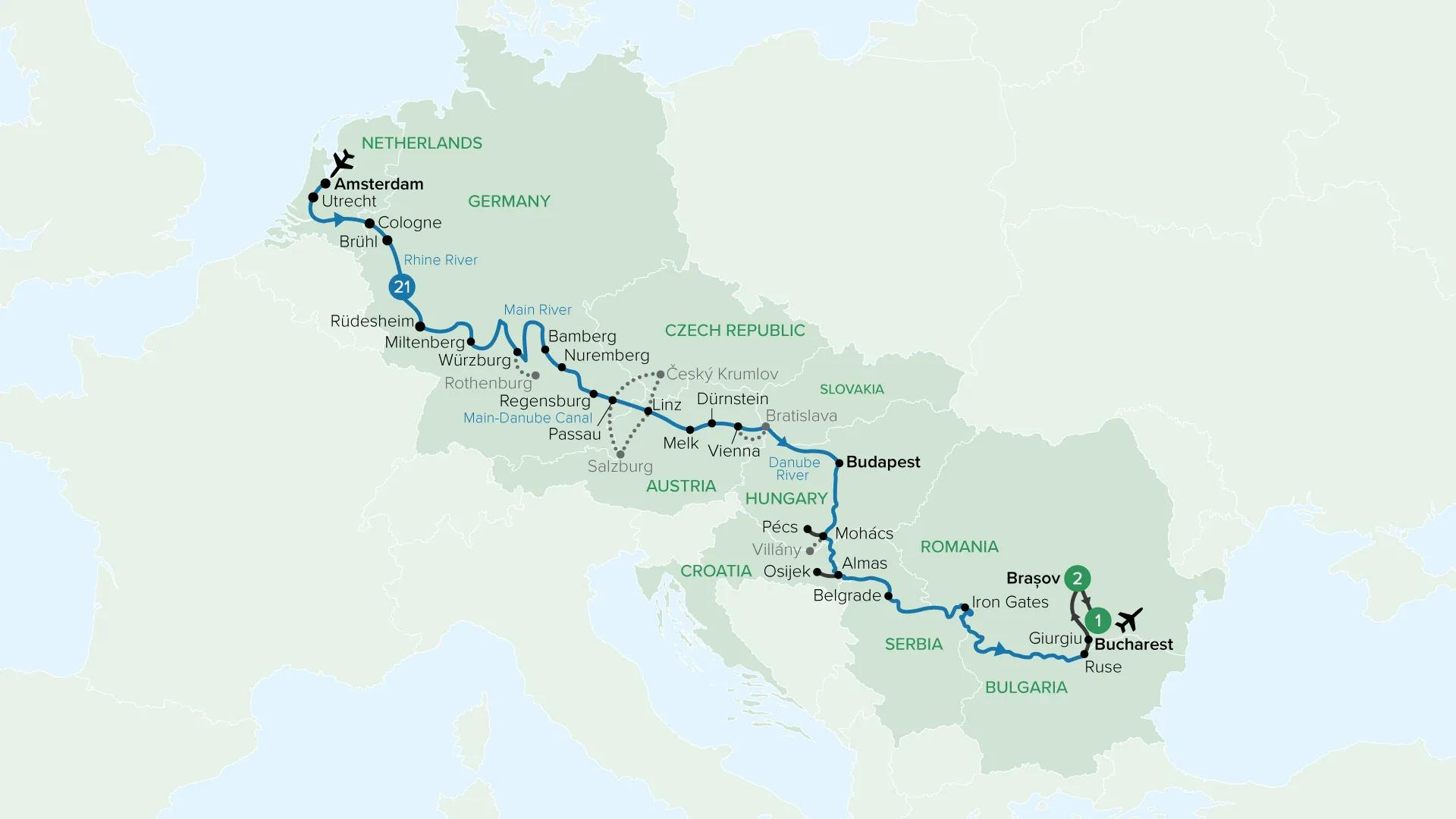 Travel from the canals of Amsterdam to the grand boulevards of Bucharest on a journey along the legendary Danube. Cruise through fairytale towns, medieval cities and vineyard-lined valleys, from Germany’s castles and Austria’s imperial elegance to the cultural crossroads of the Balkans.
