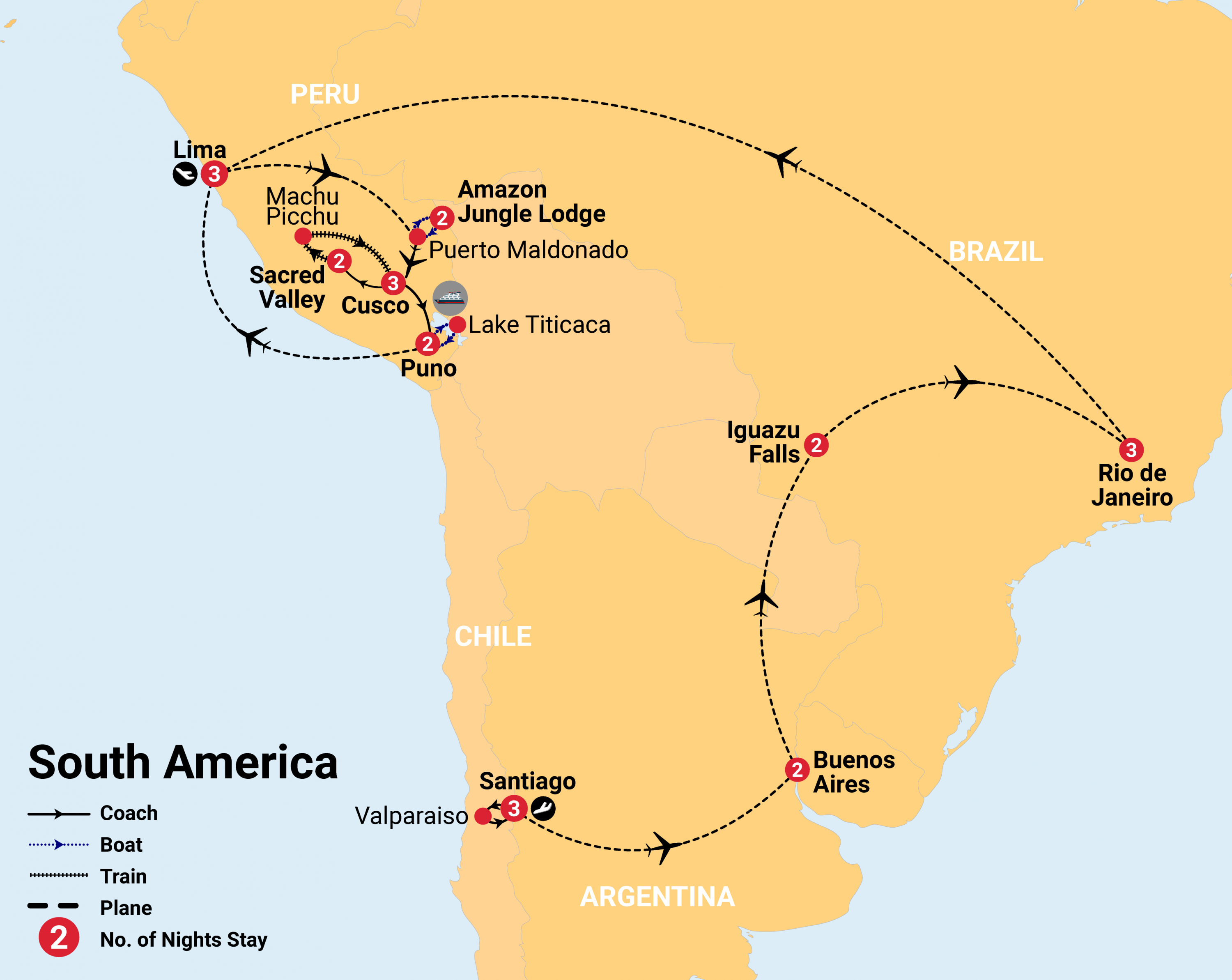 - Witness incredible natural wonders of Iguazu Falls, the Amazon rainforest, and Lake Titicaca