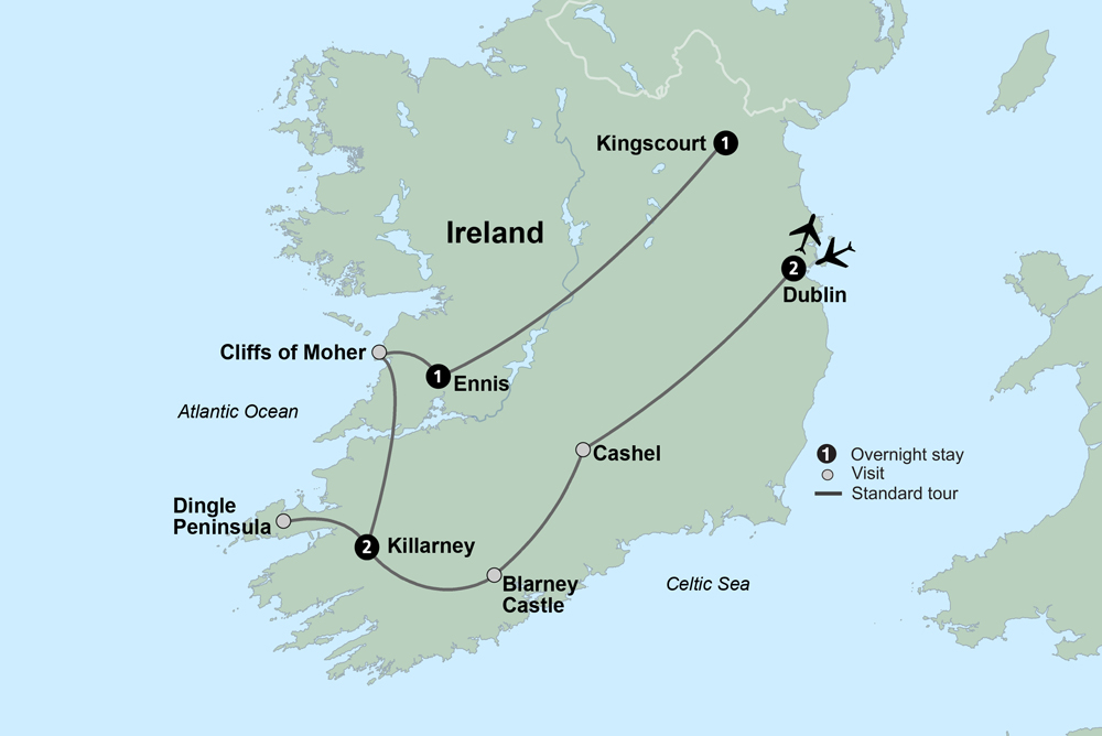 Savor a true taste of Irish splendor. Explore the historic city of Dublin by bus. Gaze upon the historic Rock of Cashel and visit the famous Blarney Castle. Explore the spectacular Dingle Peninsula. Discover the fascinating story of Hollywood legend Maureen O’Hara and her connection to Foynes. Stand in awe on the Cliffs of Moher. Spend the night in a stately castle hotel and enjoy the atmosphere of its magnificent reception rooms. Enjoy a craft-spirit tasting at a distillery. From Dublin’s charming Grafton Street to the breathtaking sights of County Kerry, gaze across the countryside and beauty of Ireland.