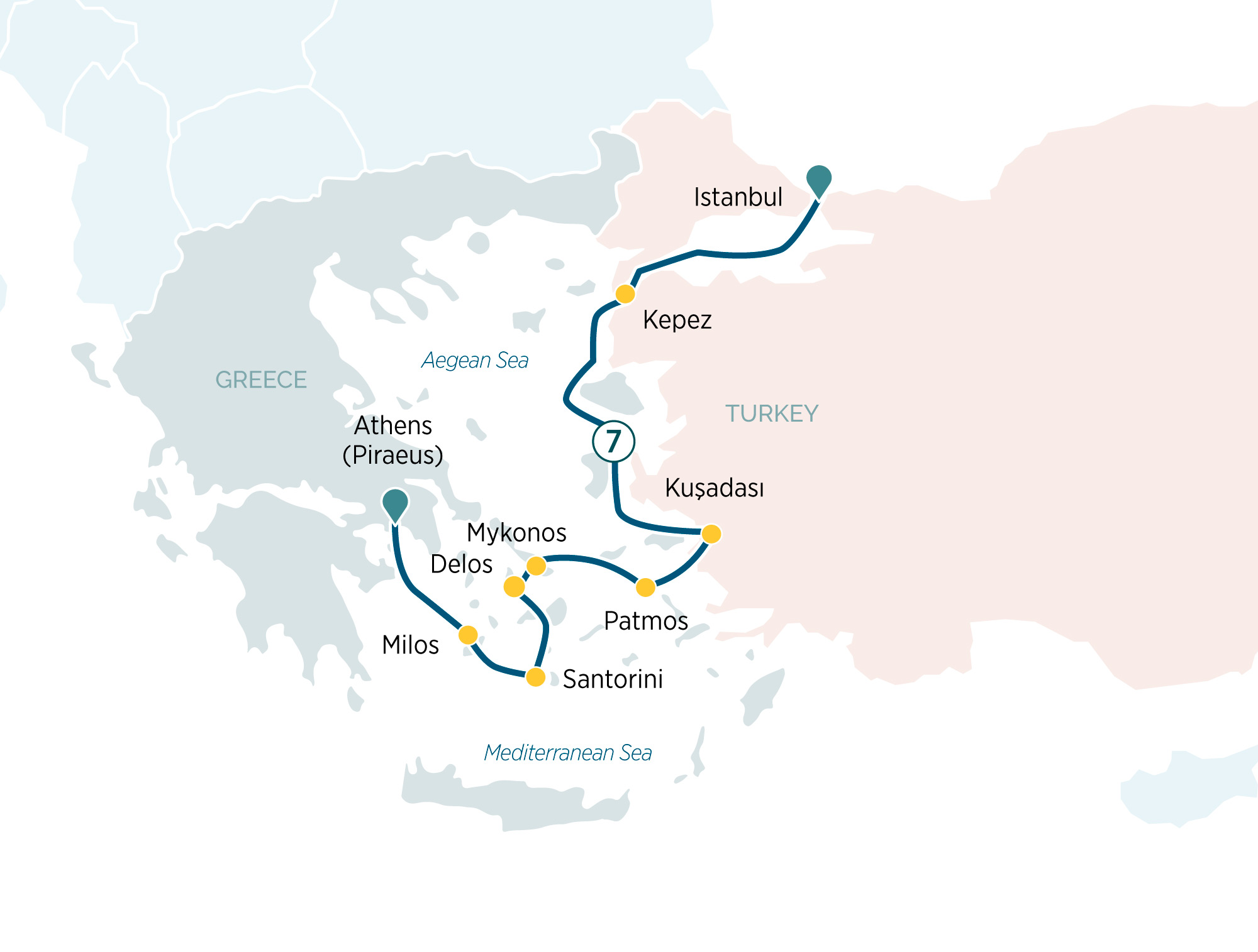 Beginning in captivating Istanbul, where Europe and Asia meet, you’ll cruise the Dardanelles Strait and Aegean Sea and explore the beautiful Greek and Turkish coastlines and a succession of stunning Greek islands, relishing ancient ruins, storied heritage and spectacular beauty, before concluding your voyage in the historic Greek capital, Athens.