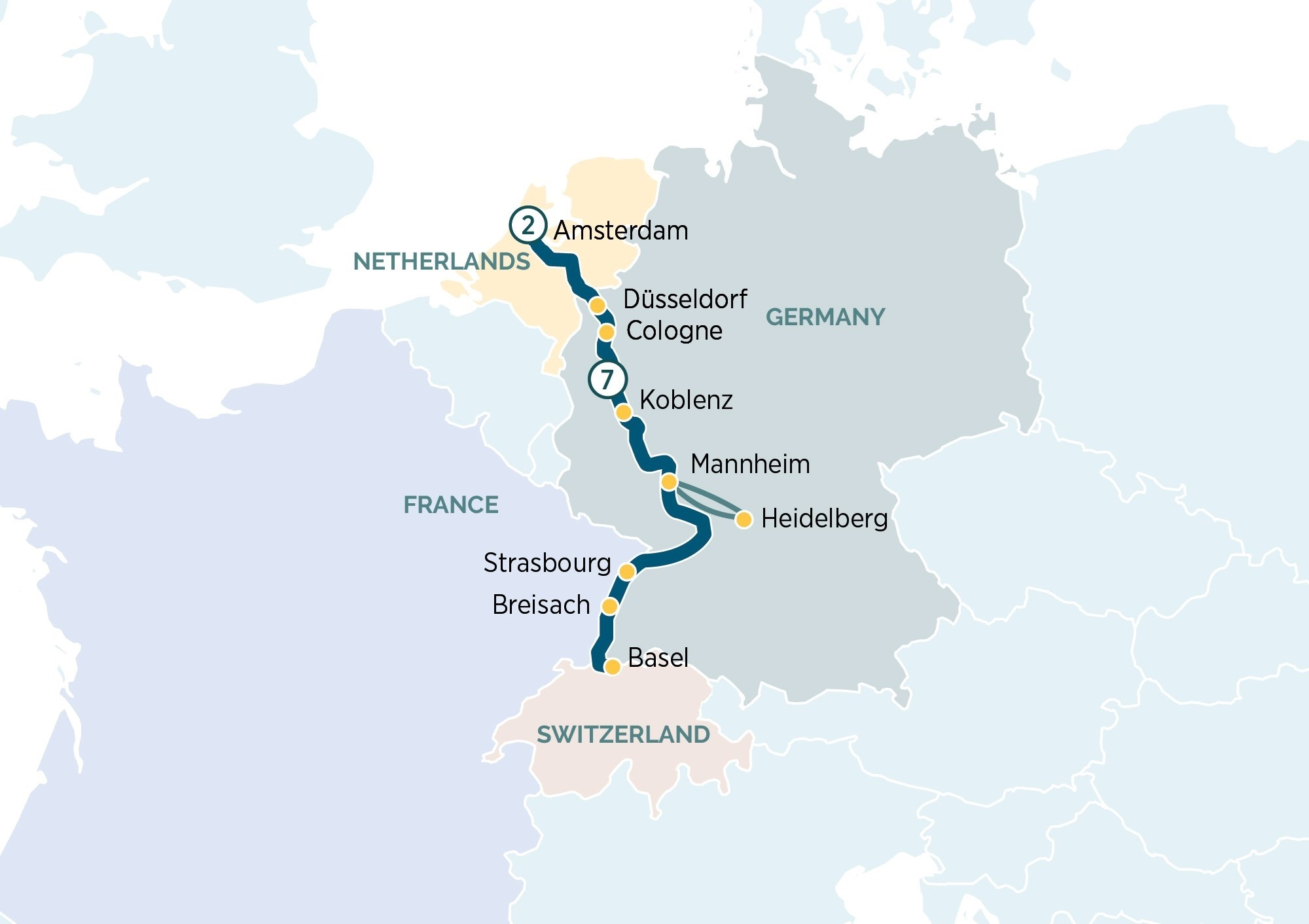 Begin your journey in the enchanting Black Forest, crossing the German border into Strasbourg, France's Alsace capital. Discover archaic Germany in Koblenz and Heidelberg, delighting in local wine tastings. Cologne's Gothic cathedral will be a highlight, before sailing past a landscape of traditional windmills into the Netherlands. A vibrant celebration of all things quintessentially Dutch, Amsterdam’s winding canals and a trip to Keukenhof Gardens offer the perfect way to end your river cruise. Explore Amsterdam further with a two-night stay.