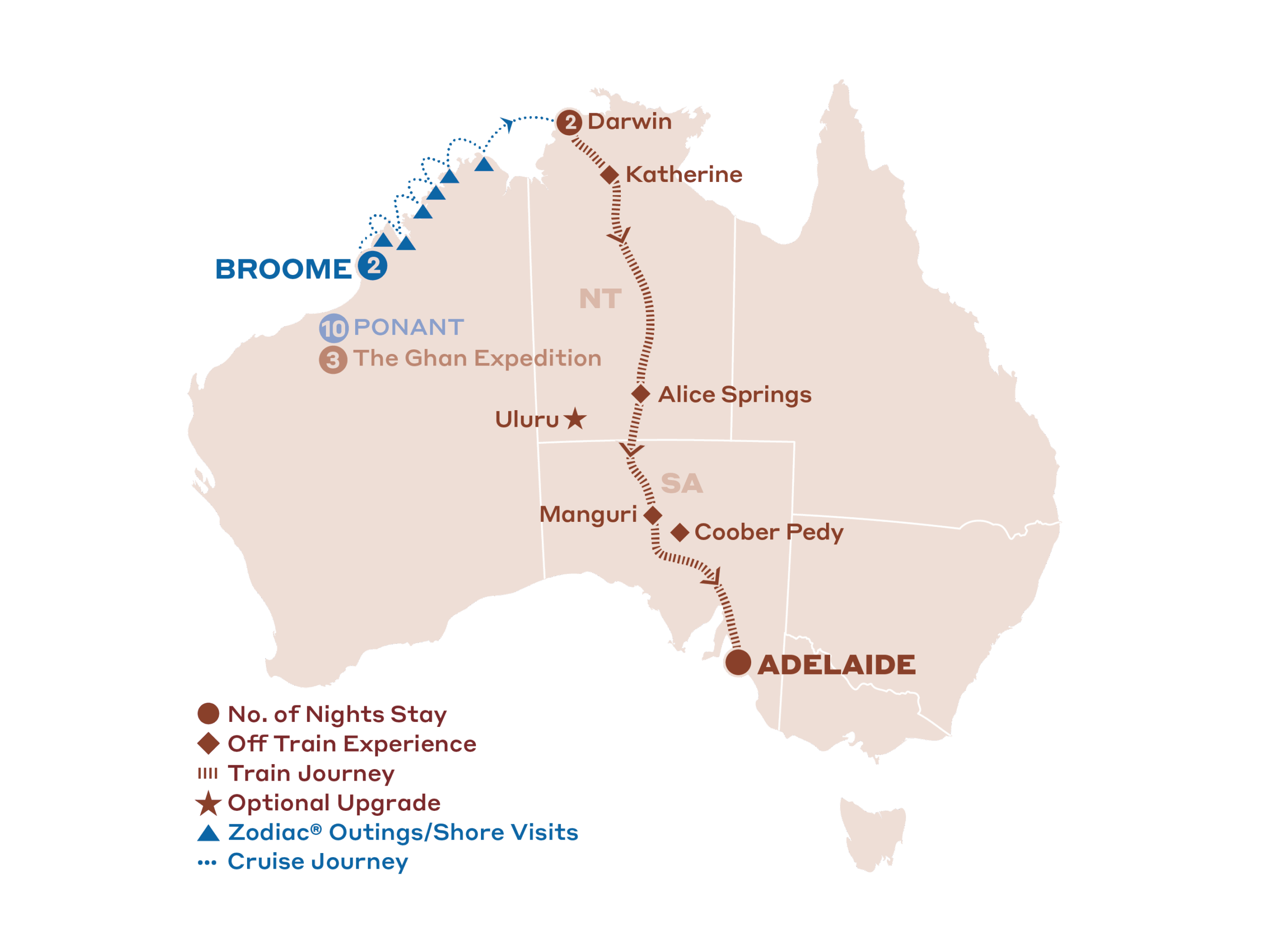 Back on board for your final night, dinner is served in the dining carriage before one last nightcap in the lounge with fellow travellers as The Ghan journeys towards Adelaide. (B,L,D)