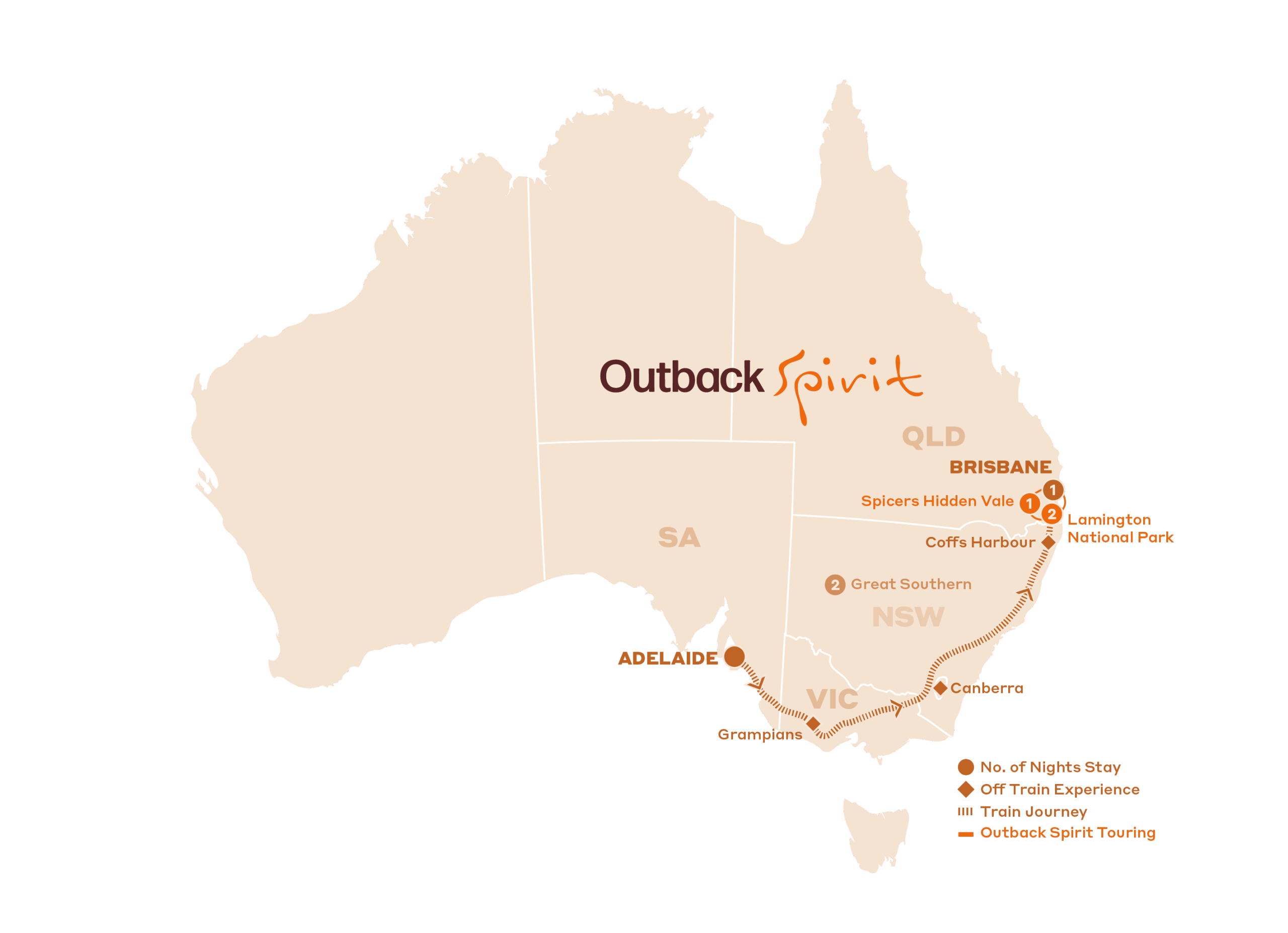 Embark on an unforgettable East Coast summer adventure with the Great Southern, departing from Adelaide and weaving through stunning landscapes and vibrant destinations. Your journey begins on the train, where you’ll enjoy gourmet meals and Off Train Experiences in the breathtaking Grampians and the cultural heart of Canberra. Explore coastal charm in Coffs Harbour, before reaching Brisbane, where you will transition to the lush hinterland of Tamborine Mountain and Lamington National Park for immersive nature experiences and exquisite dining. Relax at O’Reilly’s Rainforest Retreat and Spicers Hidden Vale, savouring local delicacies and participating in guided walks and wildlife experiences before concluding your journey back in Brisbane.