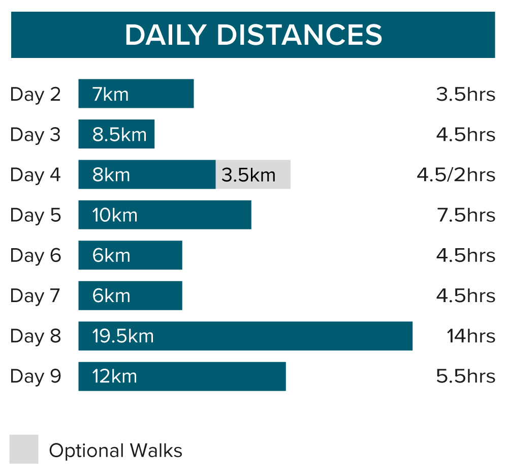 Today's 10-kilometre/6.2-mile trek is expected to take approximately seven to eight hours with an ascent of 740 metres/2,428 feet and descent of 680 metres/2,231 feet.