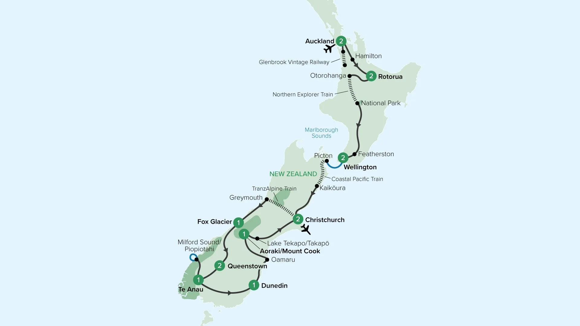 Discover New Zealand's breathtaking scenery as you experience some of the world's most incredible rail journeys, including those aboard the TranzAlpine and Coastal Pacific trains. Admire the dramatic landscapes of Franz Josef/Waiau, cruise Milford Sound/Piopiotahi, savour a Maori Hangi feast in Rotorua, and more.