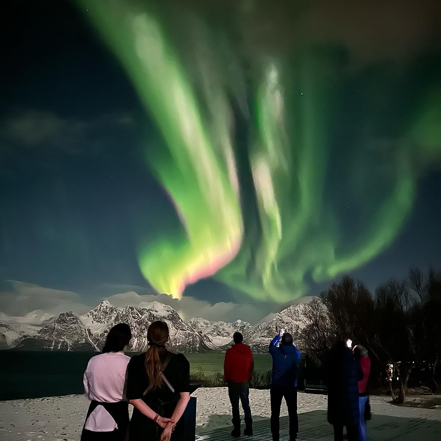 Just east of Tromsø lies the Lyngen Alps where you will stay in a traditional Norwegian timber lodge, Lyngen Lodge, beautifully situated on the fjord. This is a perfect and tranquil place to observe the Northern Lights, combined with daytime activities such as dog sledding, snowmobiling, sea safaris skiing, whale watching or snowshoeing. In-house Northern Lights photography assistance and a Northern Lights fact seminar enhance your understanding and experience.