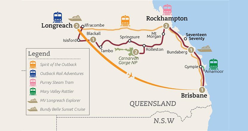 Journey from Brisbane via the charming Capricorn Coast to Longreach, discovering heritage rail and sandstone gorges.