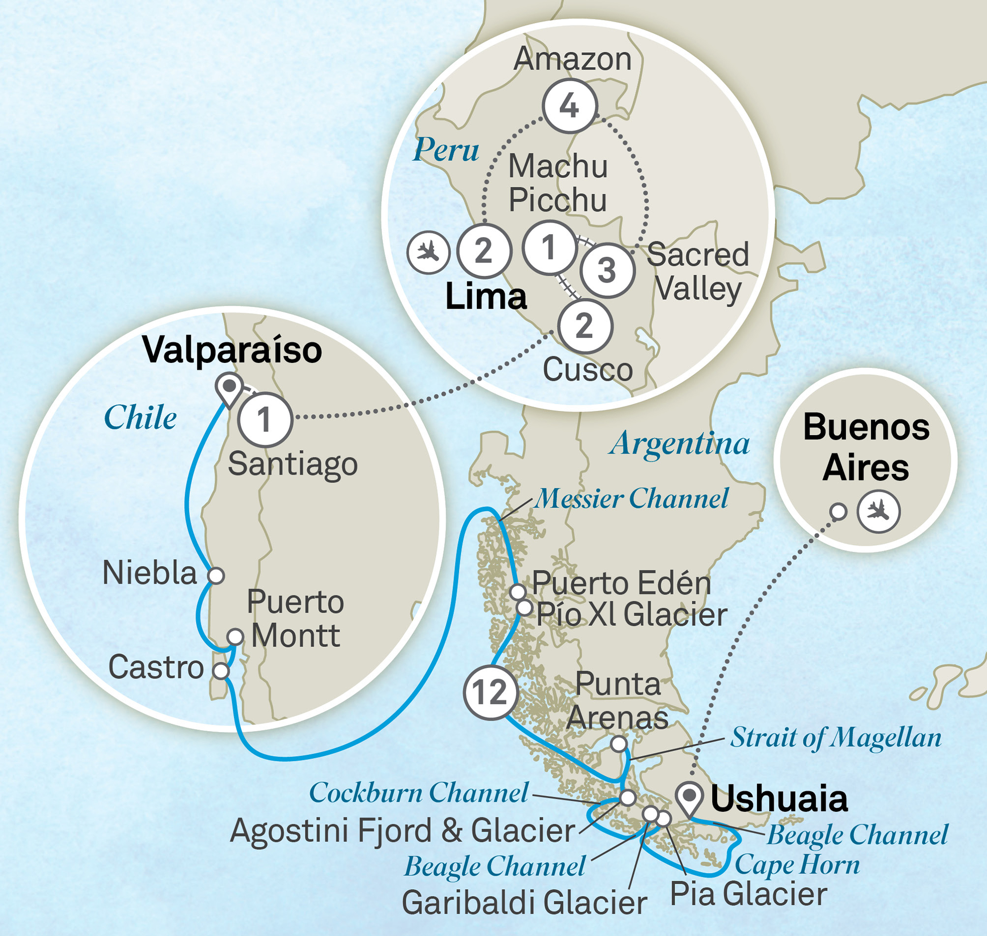 Explore untouched wilderness, witness the rhythm of life in remote villages, and connect with Indigenous communities in the remote corners of the Amazon. Ascend to the Sacred Valley and marvel at the majesty of Machu Picchu, a World Heritage-listed marvel that speaks to the enduring legacy of ancient civilisations. Then make for the coast to set sail on a 12-night cruise for an extraordinary exploration of Chile's islands and fjords. Experience the allure of historic cities, the tranquility of remote islands of Chiloé, and the majesty of glaciers. Traverse snow-capped mountains, glaciers, and fjords, retracing the legendary journeys of explorers along iconic waterways including the Strait of Magellan and Cape Horn. Brace yourself for an unforgettable ultra-luxury expedition aboard the Scenic Eclipse.