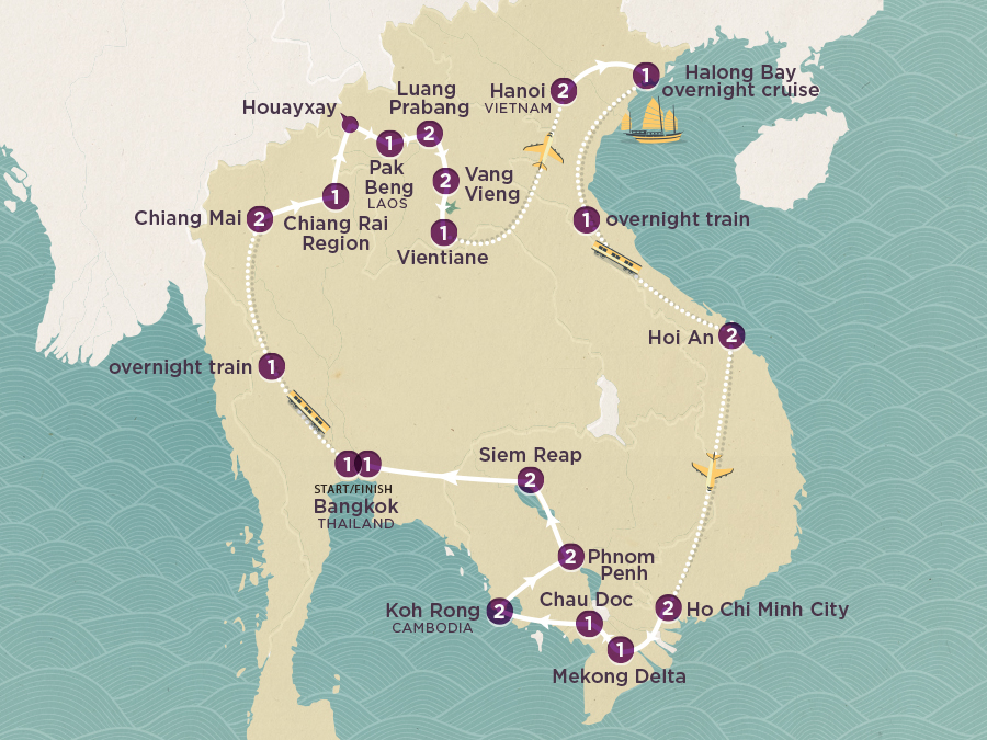 - 23 nights in hotel-style accommodation (twin or double), 2 nights on a train (quad-share), 1 night in a guesthouse (twin or double), 1 night on a cruise (twin or double), 1 night in a homestay (multi-share)