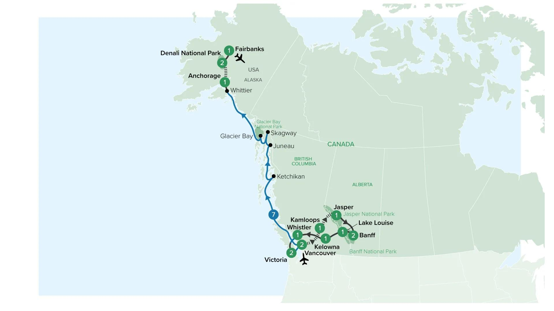 Discover the best of the Canadian Rockies, including an incredible two-day Rocky Mountaineer rail journey. Soak up the alpine scenery in Jasper, Lake Louise and Banff. Cruise the Inside Passage and finish with a land journey in Alaska, including Denali National Park.