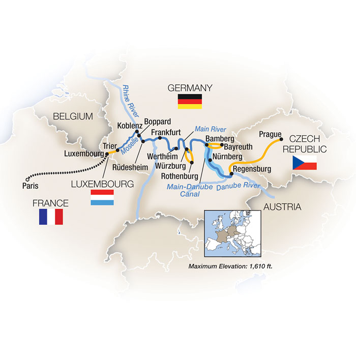 Our newest river cruise begins and ends in the heart of Europe's most romantic capital cities – Paris, France and Prague, Czech Republic, with 9 nights along the Main, Rhine, Moselle and Danube rivers and a transit through the historic Rhine-Main-Danube Canal.
