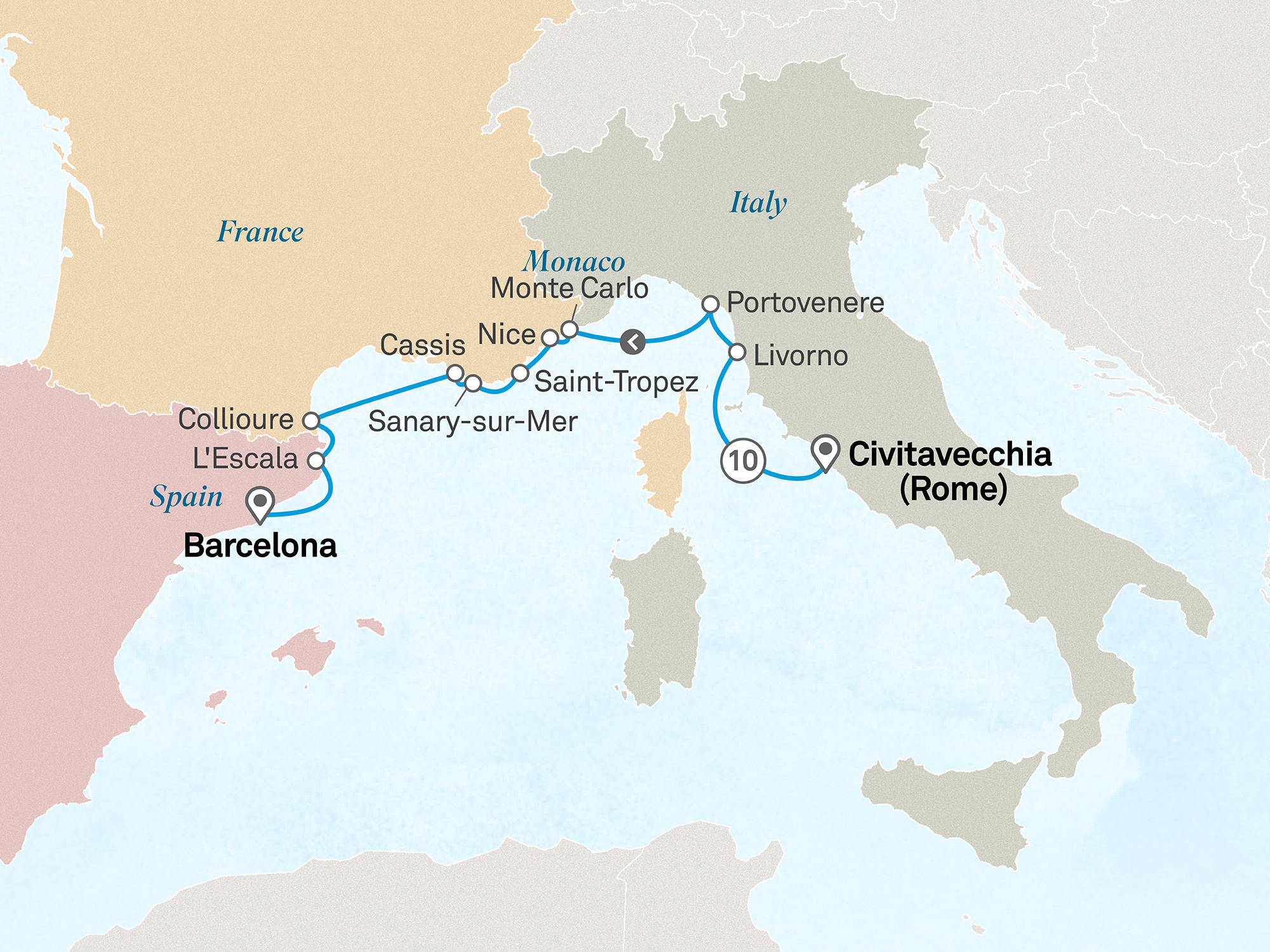 Set sail on an unforgettable journey along the sun-drenched shores of the Mediterranean, where timeless elegance meets captivating coastal beauty. Over 11 days, explore a curated selection of iconic destinations, from the historic towns of Italy to the dazzling playground of the French Riviera and beyond.