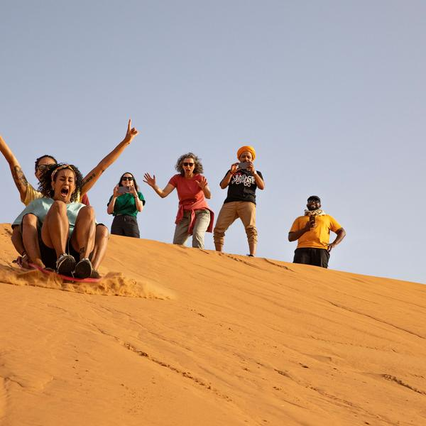 Awake as the sun rises over the mesmerizing starkness of this landscape and have some breakfast at camp amid your quiet, tranquil surroundings. Next, speed the adventure up with a 4x4 ride through the undulating sand dunes of Erg Chebbi. As you venture deeper into the region, the group will encounter the welcoming Amazigh nomads that live peacefully here and will allow you a chance to see their fascinating way of life. Savour fresh mint tea in your host’s traditional dwelling and walk with them through the village of Khamlia, where you’ll be treated to a cultural performance showcasing the rich history of Gnaoua music. Cap off this desert wandering with a Medfouna cooking class, and discover the cherished secrets of this traditional dish that is like a stuffed pizza without cheese. Enjoy a free afternoon for some of the optional activities in the area like sandboarding amid the dunes. Dinner this evening will be around another bonfire.