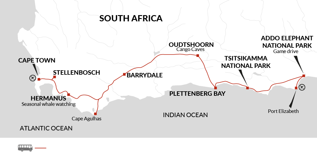 Our tour starts today in Cape Town, South Africa's Mother City, flanked by the Atlantic Ocean and the Twelve Apostles Mountain range. This vibrant city has a lot to offer but due to its ocean-side location visits to some of the highlights, including Robben Island and Table Mountain, can be weather-dependent. If you'd like to explore the city in depth before travelling down the Garden Route, we recommend adding a pre-tour stay for some extra time in Cape Town.