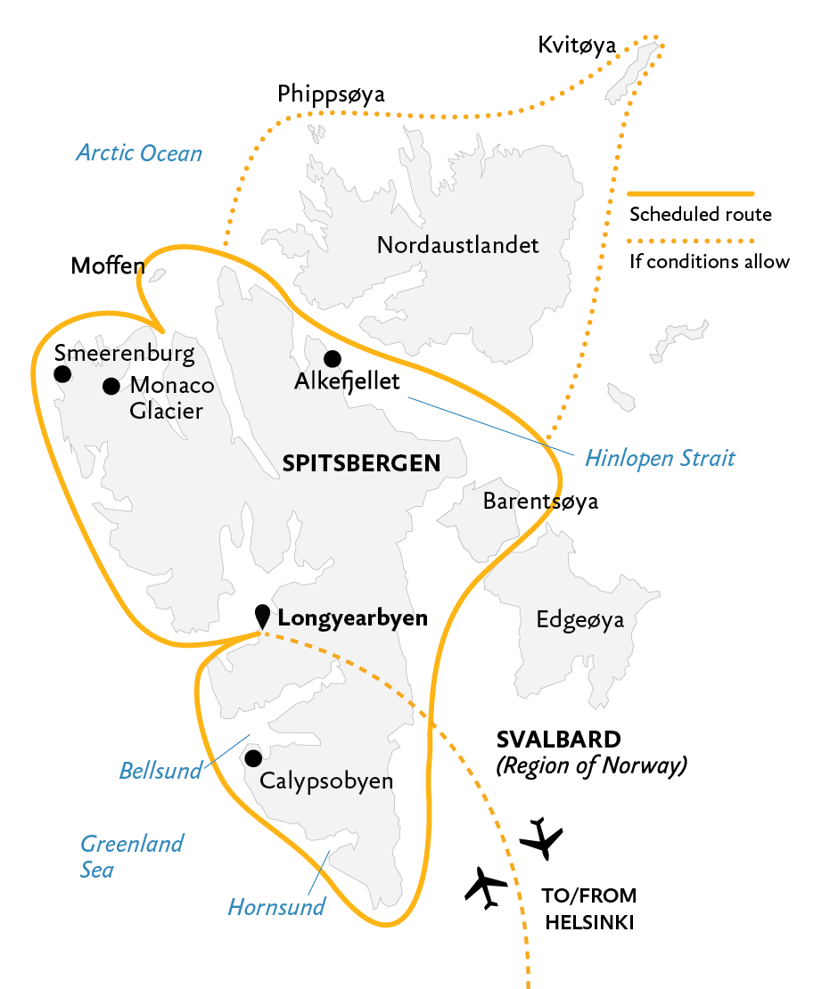 Spot iconic Arctic wildlife, such as polar bears, walrus and reindeerView numerous Arctic bird species, like puffins, Arctic terns and purple sandpipersAnticipate a full circumnavigation of SpitsbergenExplore glaciers, fjords, icebergs and more with included Zodiac cruisingImmerse yourself in the icy realm of the Arctic with optional kayaking adventuresHike the tundra and polar desert