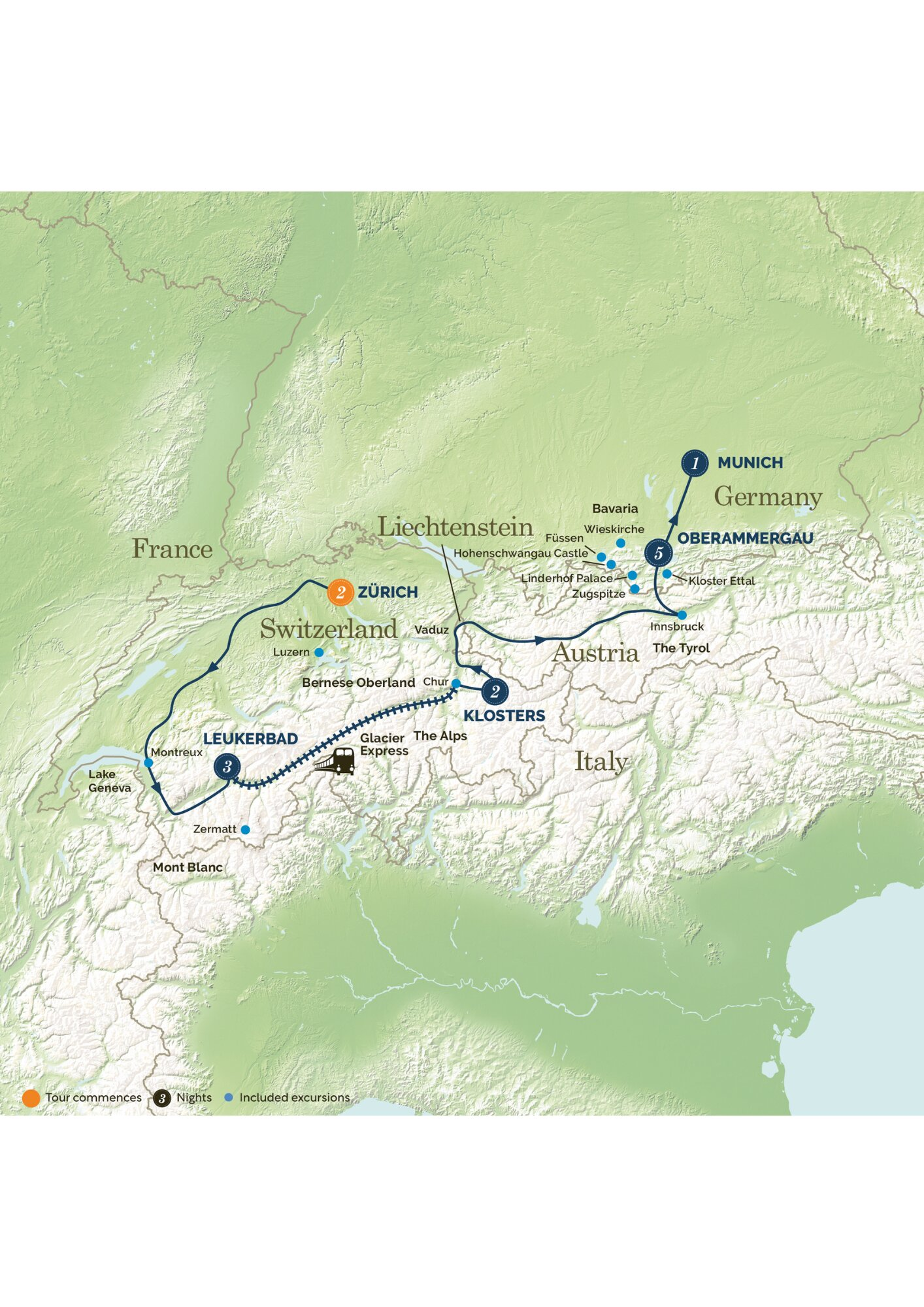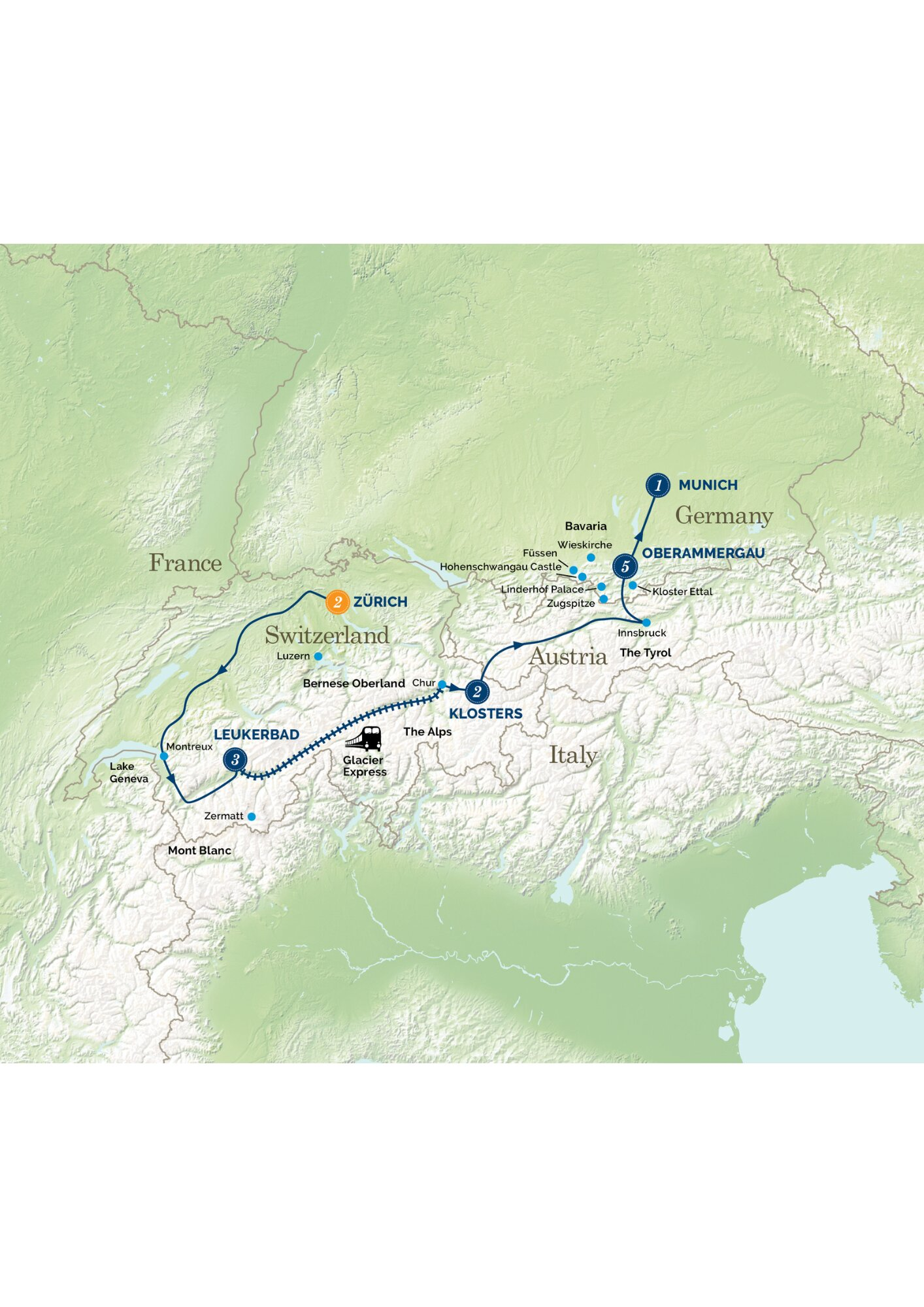 At Christmas, relax over 5 nights in the beautiful 'Passion Play' village of Oberammergau and spend your days visiting romantic 'fairytale' castles, Bavarian villages, Christmas markets, and a trip to the top of Germany's highest mountain, the Zugspitze. See Zurich's massive illuminated Christmas tree at the Christmas market at the main train station. Relax on the famous Glacier Express panoramic train as it cuts through Switzerland's mightiest peaks and explore Luzern, Montreux on Lake Geneva and Innsbruck. Stay 2 nights in the chic ski resort of Klosters and relax over 3 relaxing nights in a spa resort perched high in the snow-clad Alps, surrounded by massive, jagged peaks. Visit Zermatt and ride high on a train to the top of Gornergrat mountain for staggering Matterhorn views. What fun!