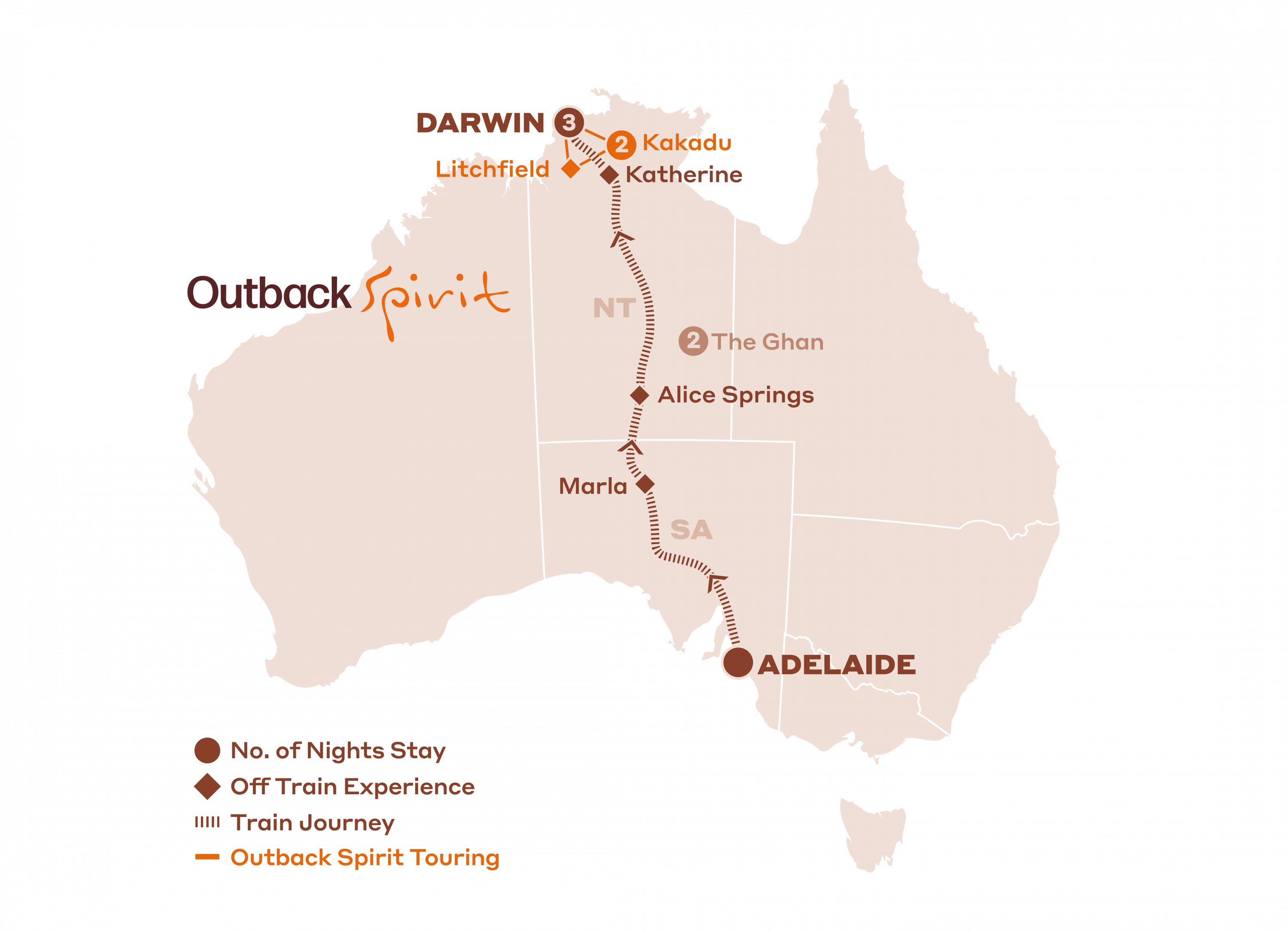 After your first night enjoying the fine dining and relaxed comfort of this iconic train, you’ll wake to an unforgettable outback sunrise at Marla – a remote outpost 160 kilometres from the Northern Territory border that marks the start of the Oodnadatta Track. Enjoy the magnificent scenery as you make your way onwards to Alice Springs, where you have a selection of Off Train Experiences to choose from. There’s an experience to suit everyone, from an off-road mountain bike adventure to the Alice Explorer tour, a cultural experience at Standley Chasm, meeting the wildlife at the Desert Park, or taking in the astounding beauty of Simpson’s Gap. Alternatively, take it all in from the air, with an optional upgrade helicopter flight. (B,L,D)