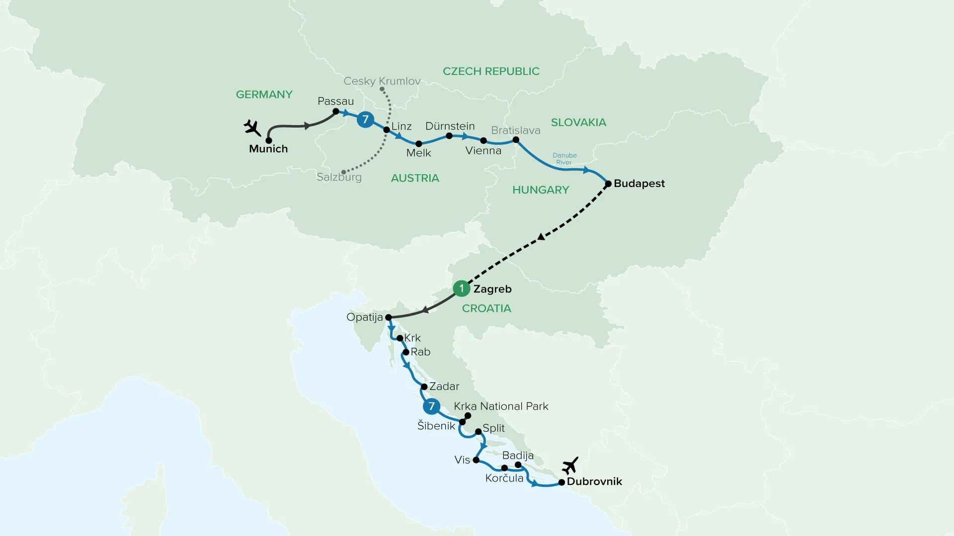 Discover the best of Central Europe and the Adriatic on a river and coastal cruising journey. Sail along the Danube River aboard a premium river ship, taking in the charm of Budapest, Bratislava, Vienna, and other picturesque towns steeped in history and culture. Explore Croatia’s stunning coastline with visits to island gems and historic cities including Dubrovnik, Korcula, Split, Šibenik, Zadar, and Krk. Beginning in Munich, this journey offers a rich tapestry of guided tours, local cuisine and immersive cultural experiences.