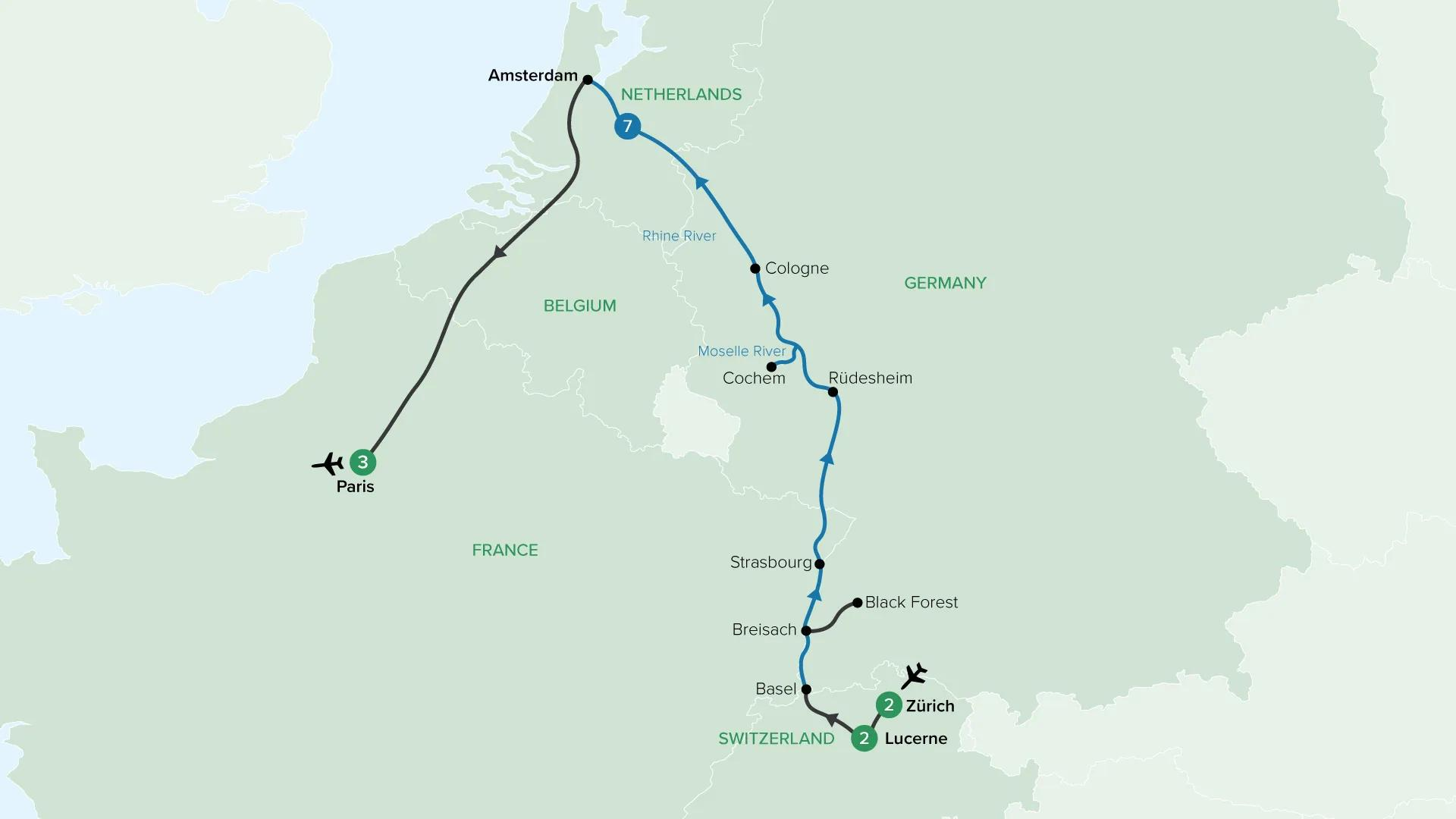 Enjoy the best of Europe on a 15-day journey that blends river cruising with alpine discovery. Cruise from Amsterdam to Basel through vineyard-lined valleys and charming towns along the romantic Rhine and Moselle Rivers. Then, continue to Paris, Lucerne and Zürich, exploring both cities on land and ascending Mt Pilatus by cogwheel train for breathtaking panoramic views.