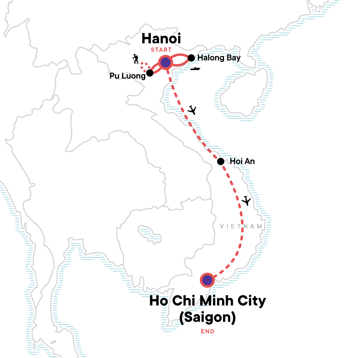 From the organized chaos of Hanoi and Ho Chi Minh City to the soothing lush green terraces of Pu Luong, Vietnam pushes you to let go, step out of your comfort zone, and reconnect with your inner explorer. Vietnam can feel unfamiliar and familiar all at once. Try foods you have never even heard of before while being greeted with smiling hosts who feel like familiar friends. Welcome to Hanoi, and to Vietnam, and we invite you to dive in, push your limits, and refill your cup.