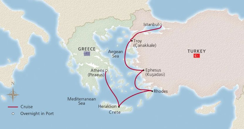 Trace the origins of civilization as you sail the Aegean Sea. Spend two days in Istanbul, a compelling blend of Eastern and Western cultures. Travel to the ruins of Troy, long steeped in myth and a UNESCO World Heritage Site. Explore historic sites in Ephesus and experience the distinct character of the islands of Rhodes and Crete. Discover the architectural legacy of ancient Athens and the city’s charming port of Piraeus during an overnight stay.