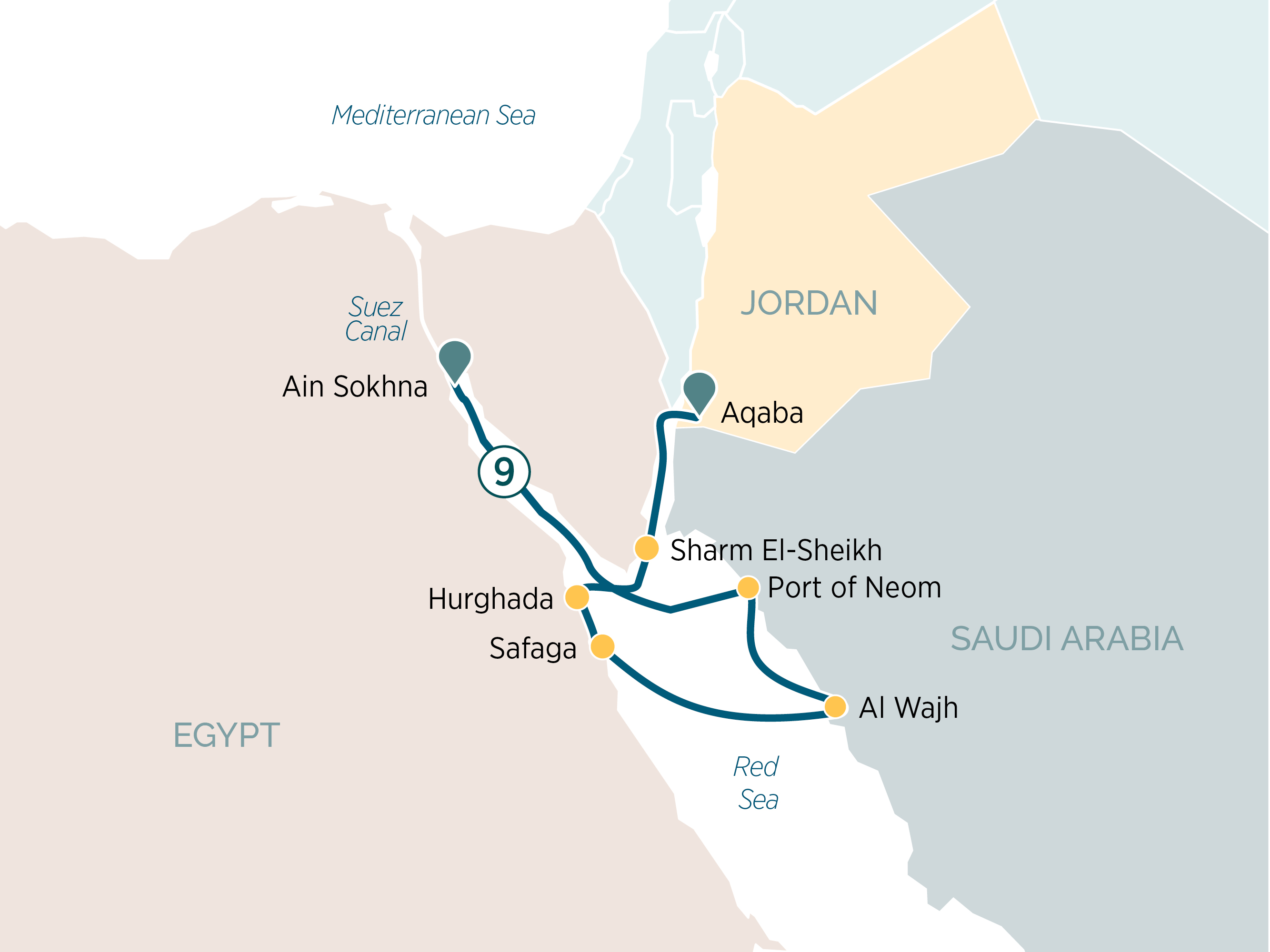 Sail through the heart of the Red Sea, exploring Egypt’s vibrant resorts, Jordan’s historic gateway, and the breathtaking desert landscapes of Saudi Arabia.